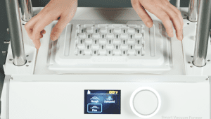 FORMART uses patented heating and vacuum technology. Just arrange your parts, place a plastic sheet, and press start—your tray is formed in minutes.