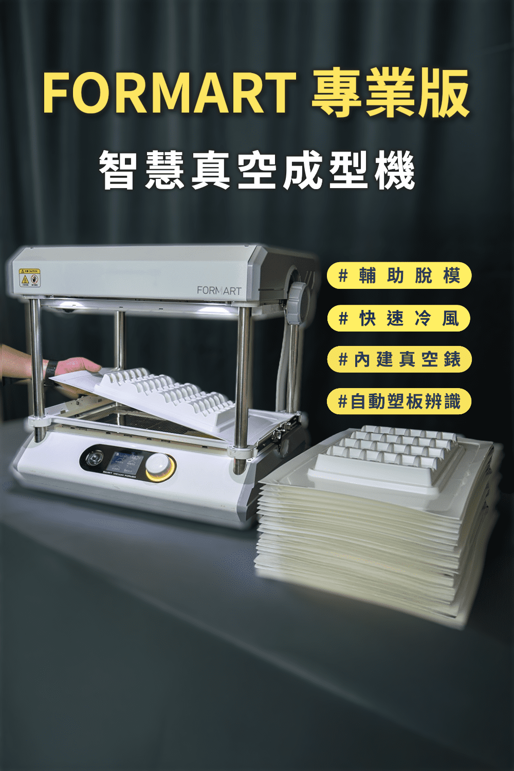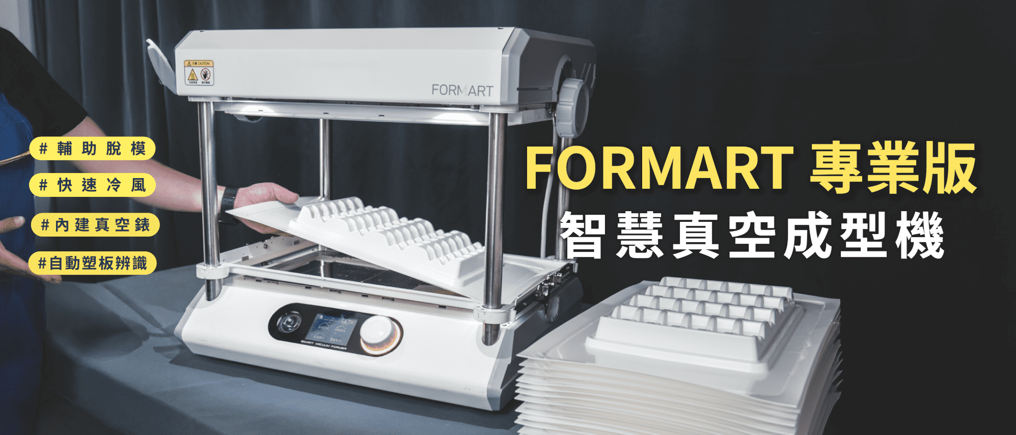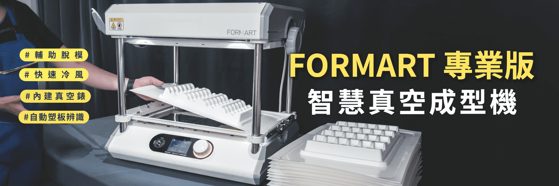 全球募資超過2000萬,MY YARD領先全球推出第一台桌上型智慧 真空成型機!我們不僅把工廠的 真空成型機 縮小,還做到了威力不減、性能與功能更大幅升級! FORMART 智慧 真空成型機 ,其精準的真空度操控與貼近使用者需求的獨家功能,顛覆桌上型工具機印象,無論是家用、個人創業、甜點烘焙、STEAM教學甚至是商品的少量生產,FORMART滿足您對 真空成型機 的所有期待。
